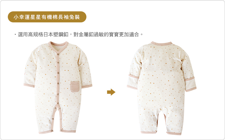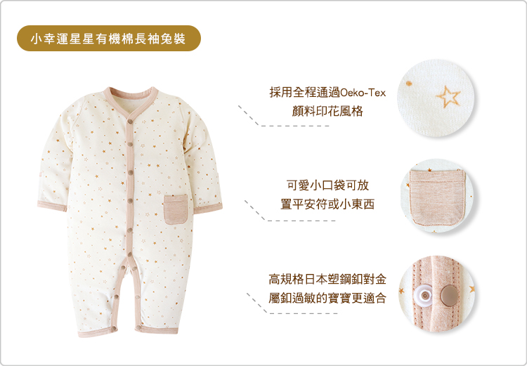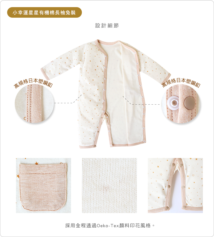 | 商品說明: ※此款式12M尺寸(因6個月以上寶寶活動量較頻繁,無反折袖口設計) .採用全程通過Oeko-Tex顏料印花風格。 .可愛小口袋,可放置平安符或小東西。 .選用高規格日本塑鋼釦,對金屬釦過敏的寶寶更加適合。 .當寶寶爬行時,也不會因為露出肚衣而著涼喔!帶給秋冬出生的寶寶們,暖呼呼的溫柔呵護! .獨家設計經典又舒服的款式,採用全程通過Oeko-Tex顏料印花,材質溫潤舒適觸感極佳,寶寶可安心使用。 .棉質LOGO布標減低摩擦機會 .袖口『 翻折式 』設計,可避免寶寶抓傷小臉及手部保暖。 |