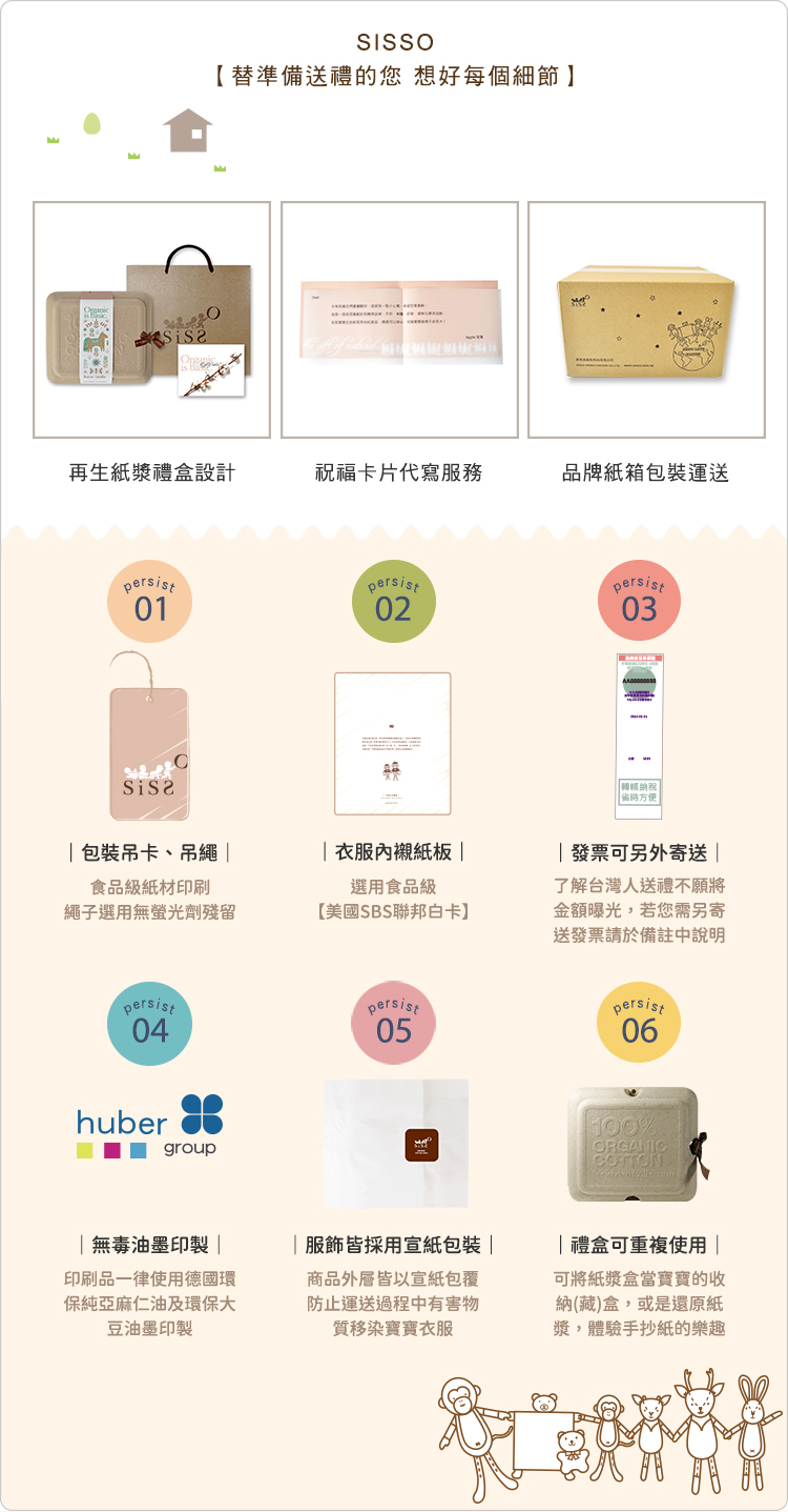 注意事項: ◎如購買質感禮盒館商品,商品已包含精緻禮盒包裝,無須再另行加購空禮盒包裝! .禮盒為單一尺寸:長23 x 寬20 x 高12 (cm) .貼心的禮盒包裝:SISSO幫每位送禮的朋友,準備了精緻禮盒包裝、並附上一張祝福卡片,讓您寫下對寶寶的祝福與祈禱,期待每位寶寶都能得到甜蜜的安心呵護。 .祝福卡片:如果您需要直接將禮品寄送給遠地的寶寶,SISSO也可以為您填寫祝賀卡片,請於訂單備註中註明卡片內容 / 或由SISSO為您填寫卡片內容。 .發票可另外寄送:了解台灣人送禮不願將金額曝光,若您需另外寄送發票,請於訂單備註中說明。 .如購買商品過多:恕無法將全部商品統一包裝至禮盒,剩餘商品將以提袋另外包裝。 .抱抱米小猴布偶因體積過大,恕無法包裝成禮盒。 內含商品: SISSO特色: |