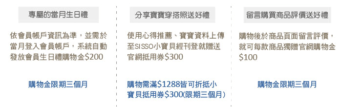 .官網購物金&抵用券為SISSO有機棉會員專屬,恕無法在實體通路使用。