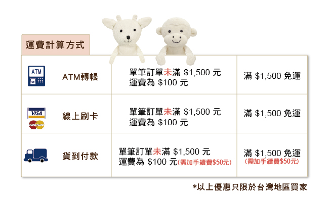 | (2) | 若因地址查無此人或以拒收方式退件,本訂單將自動取消。此情形累計三次,將限制使用貨到付款服務,日後訂購需以其他方式付款。 |